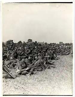 After Aubers Ridge, the corps was then rested in a quiet sector until September, when it deployed for the Battle of Loos.[38] The initial attack was to be made by three divisions, with the Meerut Division leading the attack on the Indian front; Blackader's brigade, with two Gurkha battalions and the 2nd Leicesters, was on its right flank.[39] Whilst the attack successfully crossed no-man's land under cover of the barrage, the right flank of the brigade was caught up in defensive wire, and only one battalion successfully made their way into the German trenches; the brigade lost momentum and dug in.[40]