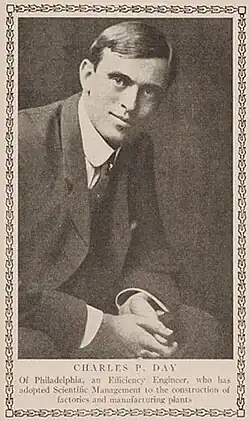 In the mentioned 1911 article in The American Magazine by Frederick Winslow Taylor, Day was presented as "Charles P. Day[17] of Philadelphia, an efficiency engineer, who adopted Scientific Management to the construction of factories and manufacturing plants."[9] For the design of manufacturing plants and civil works, Day co-founded his own engineering firm that still exists today. Day did more than just adopt ideas, and brought them into practice. He developed one or two innovative graphical techniques, and with that contributed to the graphic history of scientific management.[18]