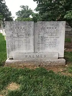 Palmer died in Washington, D.C., on 7 June 1999, at the age of 97 of cardiac arrest in his home in Knollwood, a military retirement community.[1] He was survived by Eugenia Kingman Palmer, whom he married in 1954, and a son. He was buried in Arlington National Cemetery, next to his brother and wife Eugenia K.[3]