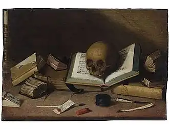 A number of still lifes with books are attributed to Biset. These still lifes stand in a tradition of vanitas still lifes with books that was popular in Flemish and Dutch still life painting in the 17th century. An example is the Still life with books and a skull (Sold at Alain Truong, 18 December 2008 in Paris). The composition depicts a table on which rest a number of writing implements, some sealed letters and old books. On top of one book which is opened and appears to be handwritten rests a human skull. The message of the work appears to be that human endeavours as expressed in personal writings are futile as death is the ultimate outcome.
