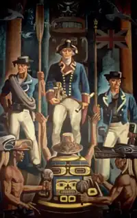 The Canadian National Railway commissioned Captain Vancouver for Hotel Vancouver in 1939. After months of research and planning, Comfort decided to depict a hypothetical encounter between Captain George Vancouver and an unnamed Indian chief at a potlatch ceremony. Comfort researched the clothing of the era and consulted Aboriginal anthropologist Dr. Marius Barbeau and others. The painting was removed in 1969 when the hotel was renovated. The wife of Governor General of Canada Roland Michener discovered the work after it was briefly misplaced and donated it to the University of British Columbia. From this time aboriginal viewers have raised concern over the representation of the First Nations people, as Captain Vancouver physically stands triumphantly over the aboriginal men.[12]