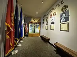 The Charles George Beloved Veterans Hall was opened officially at the Museum of the Cherokee Indian on Veteran's Day, Nov. 11, 2019. In addition to a display honoring PFC George, the Hall contains memorial displays for four EBCI Beloved Men and Women who were veterans including: Lula Owl Gloyne, a 2nd Lieutenant in the U.S. Army Nurse Corps in World War I; Jerry Wolfe, a U.S. Navy veteran who was part of the Normandy Invasion in World War II; former Principal Chief Robert S. Youngdeer, a Marine Corps and Army veteran who was wounded in World War II and received the Purple Heart; and Lt. Col. Kina Swayney, the highest ranking EBCI woman in the Tribe's history. “The four Beloved Men and Women, all veterans of the United States Armed Forces, honorably served,” Staff Sgt. (Ret.) Warren Dupree, of the Steve Youngdeer American Legion Post 143, said during the Hall's opening. “Once they separated from active duty, they returned home to continue that service in their community. They took their lives, both military and civilian professional lives, to an extremely high level. They were and are true role models for our youth.” [6]