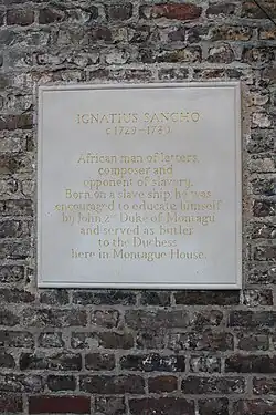 - A plaque to the memory of Sancho was unveiled on 15 June 2007, by Nick Raynsford, MP for Greenwich, on the remaining wall of Montagu House on the south-west boundary of Greenwich Park. The plaque was funded by the Friends of Greenwich Park to commemorate the bicentenary of the Abolition of the Slave Trade Act, made law in 1807. A second plaque to his memory is on the Foreign and Commonwealth Office.[38] Also in Greenwich Park, on 13 March 2024, a refurbished building was opened as the Ignatius Sancho Café.[39]