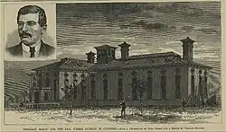 On one occasion, Guiteau trailed Garfield to the since-demolished Baltimore and Potomac Railroad Station as the president was seeing his wife off to a beach resort in Long Branch, New Jersey, but Guiteau decided to postpone his plan because Garfield's wife Lucretia was in poor health and Guiteau did not want to upset her. Having been alerted to the president's schedule by a newspaper article, on July 2, 1881, he lay in wait for Garfield at the railroad station, getting his shoes shined, pacing, and engaging a cab to take him to the station later. As Garfield entered the station, looking forward to a vacation with his wife in Long Branch, Guiteau stepped forward and shot Garfield twice from behind. The first shot grazed Garfield's shoulder, and the second pierced the first lumbar vertebra but missed the spinal cord.[35] As he attempted to escape, Guiteau collided with policeman Patrick Kearney, who was entering the station after hearing the shots.[36] Kearney apprehended Guiteau and was so excited at having arrested the man who had shot the president that he neglected to take the gun from him until after they arrived at the police station.[36] The rapidly gathering crowd screamed, "Lynch him", but Kearney and several other police officers took him to the police station a few blocks away.[37] Guiteau repeatedly said: "I am a Stalwart of the Stalwarts. ... Arthur is president now!"[38]