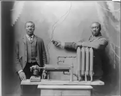 Charles S. L. Baker and his assistant demonstrating a heating/radiator system