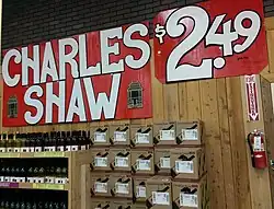 Charles Shaw is an American brand of bargain-priced wine.[1] Largely made from California grapes, Charles Shaw wines include Cabernet Sauvignon, White Zinfandel, Merlot, Chardonnay, Sauvignon Blanc, Shiraz, Valdiguié in the style of Beaujolais nouveau, and limited quantities of Pinot Grigio.
