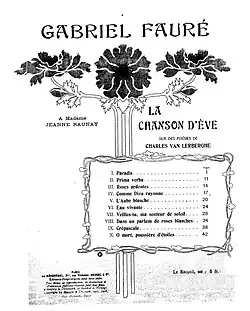 During the first half of the 20th century, other composers set song cycles from Van Lerberghe's two collections. Six from Chanson d’Éve were chosen by Paul Lacombe (Op.132, 1907);[32] eleven by Robert Herberigs in 1922;[33] and fifteen in 1925 by Alfred La Liberté (1882-1952).[34] René Bernier set four poems from Entrevisions, also in 1925,[35] while fr:Louis de Serres borrowed Fauré's title for his Le Jardin Clos, suite de 5 poèmes pour voix de femme (Op. 6 ).[36] Some single settings from Entrevisions have also been notable, particularly the Berceuse of Alphons Diepenbrock ("Le Seigneur a dit à son enfant" (1912),[37][38] and Barque d'Or ("Dans une barque d'Orient"), set in the 1920s by Aldo Finzi,[39][40] Eva Ruth Spalding also composed a single setting of van Lerberghe's "Vers le Soleil" in 1923.[41]