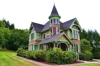 The Charles D. Drain Jr. House, also known as the Charles and Anna Drain House, in Drain, Oregon, is listed on the National Register of Historic Places. Construction of the house was commissioned by Charles Douglas Drain (b. March 2, 1861, d. March 1, 1910), the youngest son of town founder Charles Drain. Completed in 1895, the house is a prominent example of Queen Anne style architecture in Drain. The owners selected architect George Franklin Barber's Cottage Souvenir No. 2 - design number 37. Currently, the Drain school district headquarters are at the house.