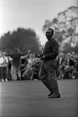 In 1957, Sifford won the Long Beach Open, which was not an official PGA Tour event, but was co-sponsored by the PGA and had some well-known white players in the field.[11] Sifford competed at the 1959 U.S. Open for the first time and tied for 32nd place.[4] He became a member of the tour in 1961 and became the first African-American to join the PGA Tour.[12] He went on to win two official money events, the 1967 Greater Hartford Open and the 1969 Los Angeles Open,[13] and finished in the top 60 in overall winnings in his first nine years as a member of the PGA Tour.[14] He also won the 1963 Puerto Rico Open and the 1971 Sea Pines. He tied for 21st place at the 1972 U.S. Open, his best finish in a major tournament.[4] He competed in the PGA Seniors' Championship, then the leading tournament for golfers over fifty, winning the event in 1975.[10]