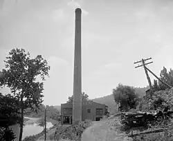 A location was selected east of Charlottesville where the C&O mainline followed the Rivanna River, providing both an easy water supply and rail access.[29] The Red Land Power Corporation, chartered March 29, 1913,[31] was charged to construct a 2,000-horsepower plant for the C&A[32] and was merged into the C&A on November 25, 1913.[1] The old power plant was used temporarily, with new equipment, to produce AC power for the city as the new plant was being completed. Coal was provided to the new plant by way of rail, where a spur off of the C&O railway was provided to allow coal from hopper cars to be unloaded into a storage bin beneath.[33] Two 400 hp boilers were installed along with multiple turbines and generators in order to generate the electricity. The completed plant produced 175,000 kWh per month as of 1914 and consumed four hopper cars worth of coal per month; this is contrasted with the old power plant's generation of 125,000 kWh per month consuming 14–15 cars worth, demonstrating the new plant's efficiency.[34]