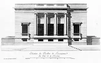 The side towards the Seine is known from a drawing made by the British neoclassicist Sir William Chambers:[4] in Chambers' drawing, unlike Ledoux's commemorative engraving (illustration, right), its three central bays project in the accustomed Gabriel manner, with attached Ionic columns and bas-relief panels above the severely plain window openings; in the flanking single bays the windows have plain entablatures surmounted by low plinths of concave profile.