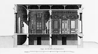 The interiors were finished and furnished with exceptional elegance. They had gilt-bronze wall-lights and other ornaments, designed by Ledoux in an advanced neoclassical taste and executed by Pierre Gouthière[7] and straight-legged chairs by the prominent menuisier Louis Delanois, in the neoclassical style we know as "Louis Seize". There are some surviving chairs of the suite, which was already in production in 1769 and must at first have been intended for the château, though they were used in the pavilion and are seen in Moreau le Jeune's drawing (illustration, left).