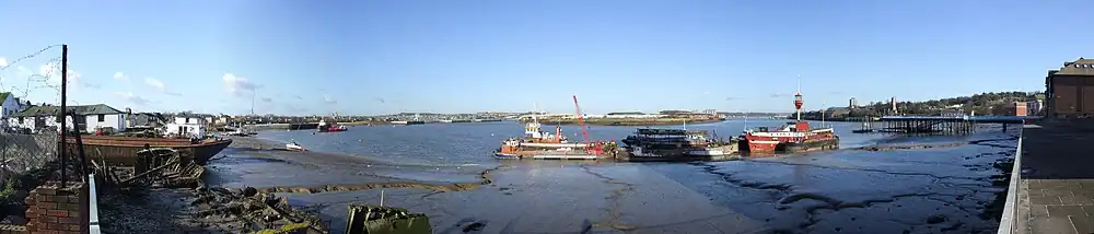 The Medway, apart from Chatham Dockyard, has always had an important role in communication: historically it provided a means for the transport of goods to and from the interior of Kent. Stone, timber and iron from the Weald for shipbuilding and agricultural produce were among the cargoes. Sun Pier in Chatham was one of many such along the river. By 1740, barges of forty tons could navigate as far upstream as Tonbridge.[21] Today its use is confined to tourist traffic; apart from the marina, there are many yacht moorings on the river itself.