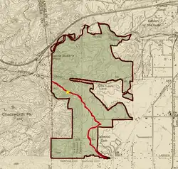 West Chatsworth and the Santa Susana Pass State Historic Park, with the Old Santa Susana Stage Road in red