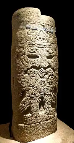 Tello Obelisk is a vertical, rectangular shaft with a step-like notch at the top. The obelisk is carved in relief on all four sides and consists of two representations of a single-type creature. The head, body and tail occupy one or the other broad sides, while the legs, genitalia and other subsidiary elements occupy the narrow sides. These creatures have been interpreted as a "cat-dragon" type of creature (by Tello) and as a cayman (by Rowe and Lathrop).[19] The large artifact may portray a creation myth.