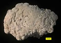 Cheilostomes first appeared in the Late Jurassic (Pyriporopsis) but diversified very slowly during the Early Cretaceous, with only 1 family known up to the Albian. During the Late Cretaceous, cheilostomes diversified rapidly to reach a level of more than 20 families in the Maastrichtian, replacing cyclostomes as the dominant group of bryozoans.[2] At the same time new forms evolved which partly or fully used aragonite instead of calcite in their exoskeleton.[3][4] This diversification is thought to be a consequence of the evolution of a new larval type.[5] Though the Cretaceous–Paleogene extinction event had some impact on genetic diversity, the rapid diversification continued into the Eocene, then apparently reaching a plateau of about 50 families up to the Holocene.