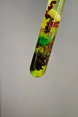A chemical garden is a set of complex biological-looking structures created by mixing inorganic chemicals. This experiment in chemistry is usually performed by adding metal salts, such as copper sulfate or cobalt(II) chloride, to an aqueous solution of sodium silicate (otherwise known as waterglass). This results in the growth of plant-like forms in minutes to hours.[1][2][3][4]
