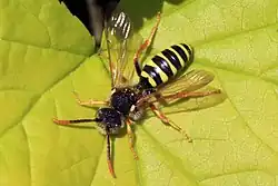 One example of a group of insects that uses this method of chemical mimicry would be cuckoo bees (genus: Nomada). Cuckoo bees will parasitize bees of the families Melittidae and Andrenidae.[4] Cuckoo bee males will produce chemicals that are similar in structure to the volatile lipids secreted by host females and these chemicals are transferred to cuckoo females so that they may camouflage their eggs within the host's nest. This would allow the females to pass off the care of her eggs and larvae onto the host, benefiting the parasite and burdening the host.[4]