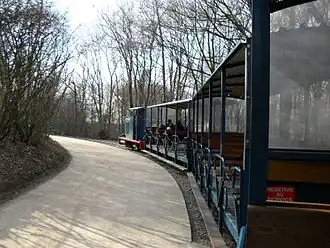At the beginning of the 1970s, on the initiative of Roger Prévot, mayor of Villeneuve-la-Garenne from May 1953 until his death on October 6, 1999, the General Council of the Hauts-de-Seine department, of which he was vice-president at the time, decided to build the Chanteraines departmental park. Three years after the opening of the first section of the park, the original 3.1-kilometer-long route between the Pont d'Épinay station (now Les Mariniers) and the Passage de Verdure station above the A86 autoroute, was put into operation in 1981. This connected the various areas of the park. In spring 1984, under an agreement with the Hauts-de-Seine General Council, the Chemin de Fer des Chanteraines (CFC) association took over the operation of the route and the maintenance of the tracks and rolling stock. In July 1991, with the expansion of the park to the south, the line was also extended to the new terminus Les Tilliers-RER (now Gennevilliers RER) with a transition to line C of the RER and tramway Line T1. On the occasion of this line extension, a second depot building was built at the train yard next to the first.[1] In October 2009, the CFC association organized the 19th International Narrow Gauge Railway Meeting. From 2010 to 2012, the northern section of the line behind the Les Fiancés station to Les Mariniers was completely renovated and was not used during this period. On March 22, 2023, the e OBO-01, the first of two purely battery-electric locomotives, equipped with compressed air brakes and built by the Compagnie de chemins de fer départementaux (CFD) in Paris, arrived at the CFC depot. After test runs in April, including with four wagons loaded with cement sacks, the locomotive made its first public passenger journeys on the open day in May.[2] On the long Ascension weekend from 9 to 12 May 2024, the CFC club celebrated its 40th anniversary.[3]