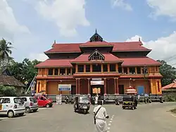 The temple is built in Kerala-style architecture, which is common in all temples in the South Indian state of Kerala. The temple has a two-storeyed gopuram or gateway tower, with the upper story having wooden rails covering the kottupura (a hall of drum beating during festivals). A rectangular wall called the kshetra-madilluka, pierced by gateways, encloses all of the temple's shrines. The metal-plated flagstaff or dvajasthambam is located axial to the temple tower leading to the central sanctum, and there is a deepastambha, which is a lamp post. The chuttambalam is the outer pavilion within the temple walls. The central shrine and the associated hall is located in a rectangular structure called nalambalam. Between the entrance of the nalambalam and the sanctum, there is a raised square platform called a namaskara mandapa which has a pyramidal roof. Thevrapura, the kitchen used to cook offerings to the deity is located on the left of the namaskara mandapa from the entrance. Balithara is an altar used for making ritualistic offerings to demigods and the festive deities. The central shrine called the sri-kovil houses the image of the presiding deity. It is on an elevated platform with a single door reached through a flight of five steps. Both sides of the doors have images of guardian deities called Dvarapalakas. As per Kerala rituals, only the main priest called Thantri and the second priest called Melshanthi can enter the sri-kovil.[6] The central shrine has a circular plan with a base of granite, superstructure of laterite and conical roof made of terracotta tile supported from inside by a wooden structure. The lower half of the sri-kovil consists of the basement, the pillar or the wall, called stambha or bhithi and the entablature called prasthara in the ratio 1:2:1, in height. Similarly the upper half is divided into the neck called griva, the roof tower called shikhara and the finial kalasam (made of copper) in the same ratio. The roof projects in two levels to protect the inner structure from heavy rains during monsoon seasons. The roof of the temple and some of the pillars have lavish wood and stucco carvings depicting various stories of ancient epics, the Ramayana and Mahabharata.[7]