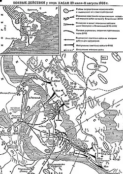 The Soviets renewed their attack on 6 August.[7] First multiple waves of bombers attacked the Japanese positions.[7] This attack was delayed either because of fog or poor preparations.[7] After the bombers an assault by tanks and infantry, including mechanized troops, supported by artillery was made.[7] In the difficult terrain the tanks suffered heavy losses, only individual tanks made it to their objectives, all of which were destroyed or retreated later.[7] During the attack an outflanking movement was made.[7] The Soviets pushed back the Japanese after heavy fighting, the subsequent days the Japanese counterattacked but were unable to recapture their positions.[7]