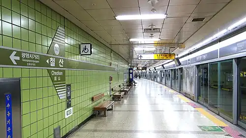 Cheolsan Station (pronounced [tʃʌl.sɑːn]) (Korean: 철산역) is a station on the Seoul Subway Line 7. It is one of the three metro stations in the suburban city of Gwangmyeong.