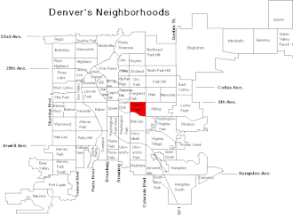 The neighborhood is located near the geographic center of the City and County of Denver and is a mixture of dense urban development and tree lined residential streets. It is bounded by the Cherry Creek on the south, East Sixth Avenue to the north, University Boulevard and Colorado Boulevard (Colorado State Highway 2) on the west and east, respectively. The neighborhood takes its name from the nearby Cherry Creek running along the south side of the neighborhood.
