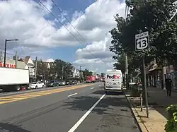When the Sproul Road Bill was passed in 1911, the road between Chester and Philadelphia was legislated as part of Legislative Route 180 and as Legislative Route 150 between Philadelphia and Morrisville.[16] With the creation of the U.S. Numbered Highway System in 1926, US 13 was designated through Pennsylvania from the Delaware border in Marcus Hook northeast to US 1/PA 1 at Bridge Street in Morrisville.[17] The route followed Post Road between Marcus Hook and Chester, Chester Pike between Chester and Darby, and Main Street through Darby before it reached Philadelphia. This route effectively replaced part of the Capitol Trail, an auto trail connecting Philadelphia and Atlanta via Washington, D.C.[18][19] US 13 passed through Philadelphia along Woodland Avenue, Market Street, Broad Street, Diamond Street, Front Street, Kensington Avenue, and Frankford Avenue. The route continued into Bucks County and followed Bristol Pike to Morrisville, where it headed north on Philadelphia Avenue and Pennsylvania Avenue to US 1. In Philadelphia, US 13 ran concurrent with US 1 on Woodland Avenue north of Baltimore Avenue, US 1 and US 30 on Market Street and Broad Street north to Vine and Race streets, and US 1 on Broad Street between Vine Street and Diamond Street.[17][20][21] US 13 was originally designated concurrent with PA 91 between the Delaware border and Philadelphia and with PA 32 between Philadelphia and Morrisville, where that route continued north along the Delaware River.[22] In 1928, the concurrent PA 91 and PA 32 designations were removed.[23]