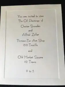 Since 1964, Chester Snowden and Alfred Zeller worked together in their Thirteen Ten Art Studio & Galleries, located at 1310 Truxillo Street in Houston, Texas. They offered classes in oil painting and other mediums as well as framing.[2]
