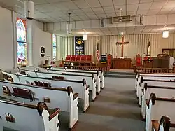 The church contains several beautiful historic stained glass windows, some dating back to the late 1800s. Several of these were damaged by an EF-1 tornado on June 13, 2022. They are restored as of June, 2023.