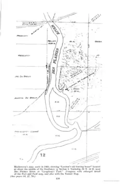Further proof that the original course of the Des Plaines River is as shown comes from the third map, one of many from the Knight and Zeuch study of the Chicago Portage.[20], p 95 This one shows the old course of the Des Plaines River and the bend in the river that marked the western end of the portage.