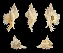 | Five views of a shell of Chicoreus orchidiflorus, 27 mm in length | |