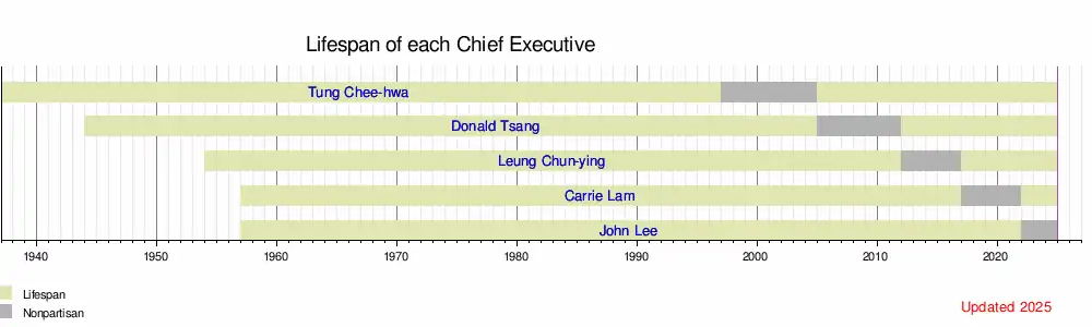 The current chief executive is John Lee selected as chief executive in the 2022 election, appointed by the Chinese State Council with the designation decree signed by Premier Li Keqiang on 30 May 2022 and took office on 1 July 2022. Lee is the fifth chief executive of Hong Kong; each of his four predecessors are still living.