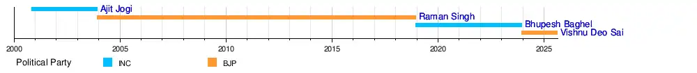 Four people have served as the state's chief minister since Chhattisgarh's formation on 1 November 2000 as a result of the Madhya Pradesh Reorganisation Act, 2000.[3] The first was Ajit Jogi of the Indian National Congress. He was succeeded in 2003 by Raman Singh of the Bharatiya Janata Party who served three consecutive five-year terms. Third person to serve in the office was Congress leader Bhupesh Baghel ,who served from 2018 to 2023, was succeeded by Vishnudeo Sai, the current incumbent, following the resounding victory[4] of Bharatiya Janata Party in the 2023 elections.