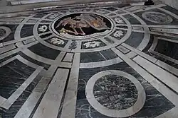 The present pavement was designed by Bernini who walled in a preexisting opening in front of the altar and raised the altar by two steps emphasizing its symbolic importance (the third step is a later addition which disrupts the decorative pattern). The elegantly molded original steps were made of monolith blocks of statuario marble. The white and grey bardiglio marble pavement has a geometric pattern corresponding with the decoration of the dome. There is an inlaid opus sectile roundel at the center, surrounded by a frame of stylized roses and oak leaves. Inside the figure of a winged skeleton is lifting the coat-of-arms of the Chigi family symbolizing the triumph of dynastic virtue over death. There is a scroll with a Latin inscription under the figure: Mors aD CaeLos (meaning "through death to heaven"). The capital letters add up the date of the beginning of the reconstruction in Roman numerals: MDCL = 1650. The roundel was executed by stonecutter Gabriele Renzi in 1653/54. (Contemporary sources prove that the inscription was originally "Mors aD CaeLos Iter", the letters adding up to 1651, the year when Fabio Chigi returned to Rome on the last day of November after his long absence abroad.)[25]
