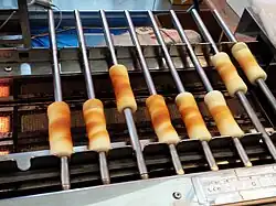 Chikuwa (竹輪) is a Japanese fishcake product made from fish surimi.[1] After being mixed well, they are wrapped around a bamboo or metal stick and steamed or broiled. The word chikuwa ("bamboo ring") comes from the shape when it is sliced.