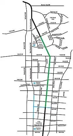 In 2013, organizers announced the Children's Christmas Parade would be moving from downtown to Midtown to make way for construction of the new Atlanta Streetcar.[7] The new parade route (shown left) started at Peachtree Street and 16th Street, in front of the High Museum of Art, and continued for 1.0 mile (1.6 km), before ending at Peachtree Street and 5th Street.