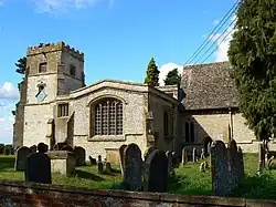 The Church of England parish church of Saint Mary the Virgin was originally late Norman, built either late in the 12th century[2] or early in the 13th,[13] but the only surviving original features are the south doorway[2] and the font.[13] The chancel was rebuilt late in the 13th century. The north and south transepts were added in the 14th century, the Perpendicular Gothic west tower in the 15th and the south porch in the 16th century. One window and a tomb recess are surviving original Decorated Gothic features of one of the transepts, but both transepts now have Perpendicular windows that were inserted later.[2][13] The tomb recess in the north transept contains a fine effigy of a knight.[3] The south transept is the larger of the two and is the family Fettiplace chapel.[2] St Mary's is notable for its numerous monumental brasses, including one to William Fynderne (died 1444) and his wife which at 52 inches (1.3 m) long[3] is the largest in old Berkshire.[14]