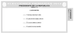 All four candidates were officially registered on 30 April 2013.[8] Affiliates from all Nueva Mayoría parties plus independent electors were allowed to vote.