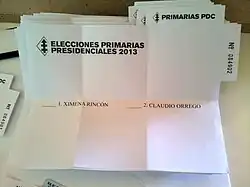 ![]() Claudio Orrego (PDC) | ![]() A primary was held on 19 January 2013 to determine the Christian Democratic Party's pre-candidate for the presidency. This primary was organized by the party and not under the new primary law. The contenders were Claudio Orrego and Ximena Rincón. Orrego won the primary with 59% of the vote.[17]