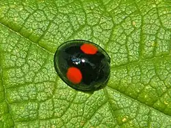 This beetle is an endemic Italian species, present in Italian mainland. It preys on scale insects living on Euonymus species. The elytra are brown-black, with two reddish round spots. It measures about 3–5 millimetres (1⁄8–3⁄16 in) long. This lady beetle was deliberately introduced to the United States by Marlatt in 1902 to control the San Jose Scale, an early example of biocontrol.[1]