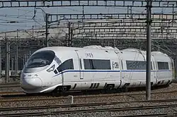 The CRH3 Hexie (simplified Chinese: 和谐号; traditional Chinese: 和諧號; pinyin: Héxié Hào; lit. 'Harmony') is a version of the Siemens Velaro high-speed train used in China on the Beijing–Tianjin intercity railway line, Wuhan-Guangzhou Passenger Dedicated Line, Zhengzhou-Xi'an Passenger Dedicated Line and the Shanghai–Nanjing intercity railway. It is capable of service speed of 380 km/h (236 mph) as the very similar Velaro E used in Spain, but, similarly to the Sapsan, it is 300 mm (11.8 in) wider to take advantage of a more generous structure gauge and thus be able to fit in more seats in a 2+3 layout.