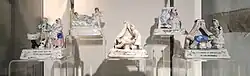 A china fairing is a small porcelain ornament, often incorporating figures, ranging from about three inches (7.5 cm) to about five inches (12.5 cm) in height, and depicting a variety of scenes, humorous, political or domestic. The ornament almost always incorporates a base and many fairings have a caption describing the scene or making some point inscribed on that base. Although the majority of fairings are simply decorative, they were occasionally made in the form of pin boxes, match strikers or holders for watches or small mirrors. Some fairings were made in pairs, for example, "Grandpapa - Grandma", two separate statuettes of a small boy and girl, each dressed in adults' clothing.