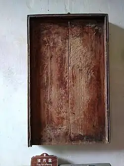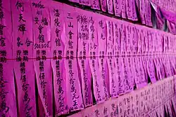 Within temples, it is common to see banners bearing the phrase "if the heart is sincere, the god will reveal their power" (心誠神靈; xin cheng shen ling).[122] The relationship between people and gods is an exchange of favour.[122] This implies the belief that gods respond to the entreaties of the believer if their religious fervour is sincere (誠心; cheng xin).[122] If a person believes in the god's power with all their heart and expresses piety, the gods are confident in their faith and reveal their efficacious power.[122] At the same time, for faith to strengthen in the devotee's heart, the deity has to prove their efficacy.[122] In exchange for divine favours, a faithful honours the deity with vows (還願; huan yuan or 許願; xu yuan), through individual worship, reverence and respect (敬神; jing shen).[122]