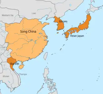 In the Tang period, other neighbouring states adopted Chinese culture and institutions, including using Chinese as the written language of administration, both to cultivate good relations with China and to strengthen their own administrations.[54] The kingdom of Balhae, established in northern Korea and eastern Manchuria in 698, followed its southern neighbour Silla in establishing a Chinese-style administration.[55] During the reign of King Mun (737–793), the state imported Chinese literary culture and institutions wholesale.[56] Similarly, the kingdom of Nanzhao to the southwest used Chinese as the language of administration and adopted Tang laws and procedures.[57] By adopting Chinese institutions, these states became stronger and more stable than their predecessors. They observed the formalities of tribute to the Tang, but functioned as independent states.[57] Almost all texts from the Dali Kingdom, which succeeded Nanzhao, are written in Chinese.[58]