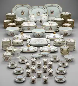 Although European crests on Chinese porcelain can be found on pieces made as early as the 16th century, around 1700 the demand for armorial porcelain increased dramatically. Thousands of services were ordered with drawings of individuals' coat of arms being sent out to China to be copied and shipped back to Europe and, from the late 18th century, to North America. Some were lavishly painted in polychrome enamels and gilding, while others, particularly later examples, might incorporate only a small crest or monogram in blue and white.[16] Chinese potters copied the popular Japanese Imari porcelains, which continued to be made for export into the second half of the 18th century,[17] examples being recovered as part of the Nanjing cargo from the shipwreck of the Geldermalsen.[18]