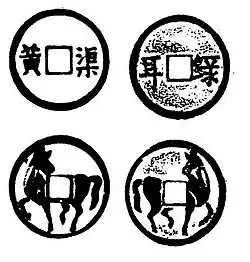 Coins made under Emperor Wang Mang of the Xin dynasty had a distinctive appearance from coinage of the Han dynasty era, and were later used as the basis of many Chinese amulets and charms.[9][10]