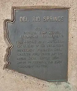 From January 22 to May 18, 1864 the offices of the Territorial Government of Arizona were operated from tents and log cabins here, before being moved to Prescott the first permanent capital.