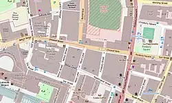 The Jugged Hare pub on the corner with Silk Street is also Grade II listed.[3]