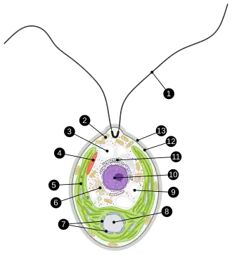 All Chlamydomonas are motile, unicellular organisms. Cells are generally spherical to cylindrical in shape, but may be elongately spindle-shaped,[9] and a papilla may be present or absent. Chloroplasts are green and usually cup-shaped.[10] A key feature of the genus is its two anterior flagella, each as long as the other.[8] The flagellar microtubules may each be disassembled by the cell to provide spare material to rebuild the other's microtubules if they are damaged.[11]